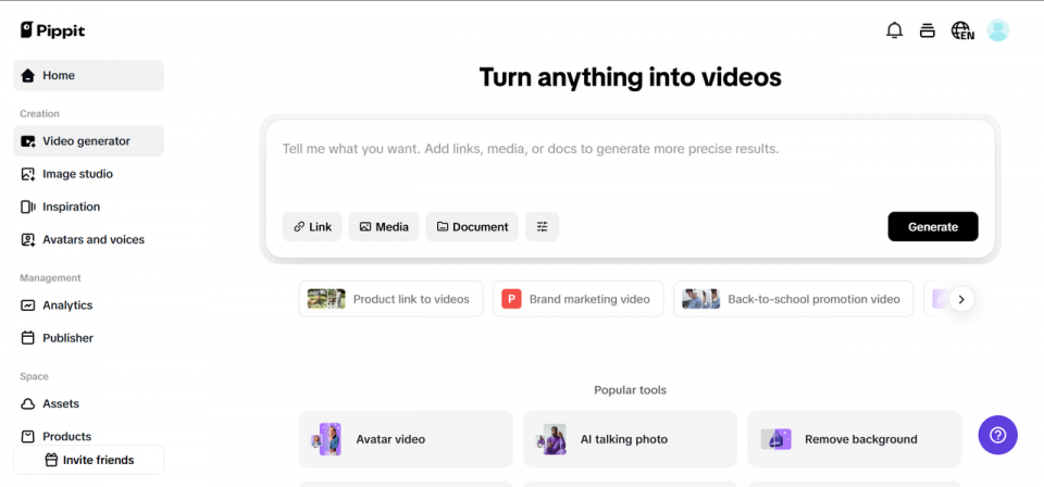 Try for free by logging into Pippit and heading to the “Video generator” section. Upload your product link, footage, or relevant content to kick things off. The easy interface means you’ll go from blank page to pro voiceover without stress.