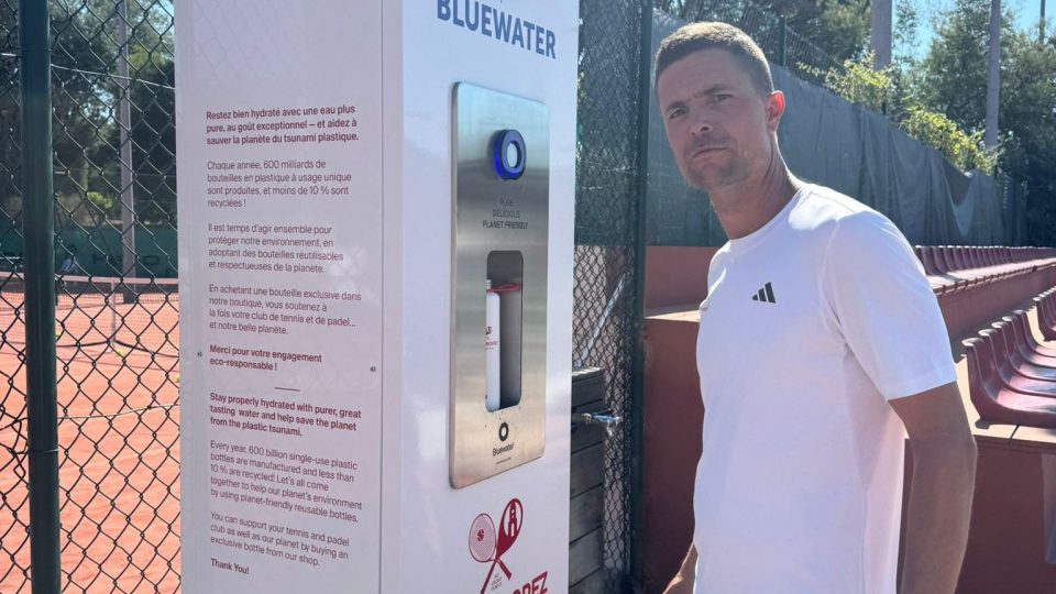 St Tropez Tennis and Padel Club Manager Benny Rousseau launches a drive against single-use plastic bottles at the club with a purified water dispenser from Bluewater