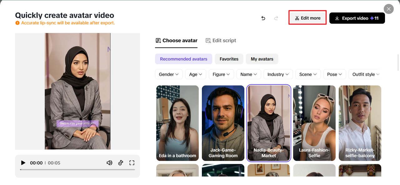 After applying lip sync, click Edit more to further edit your video. Utilize the video editor to fine-tune the script, correct voice timing, or change facial expressions for higher accuracy.