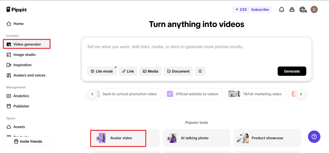 Log in to Pippit and then click on Video generator from the left menu. From the Popular tools, select Avatars to select or design AI avatars for your videos. With this tool, you can easily sync voiceovers with avatars for interactive and engaging content.